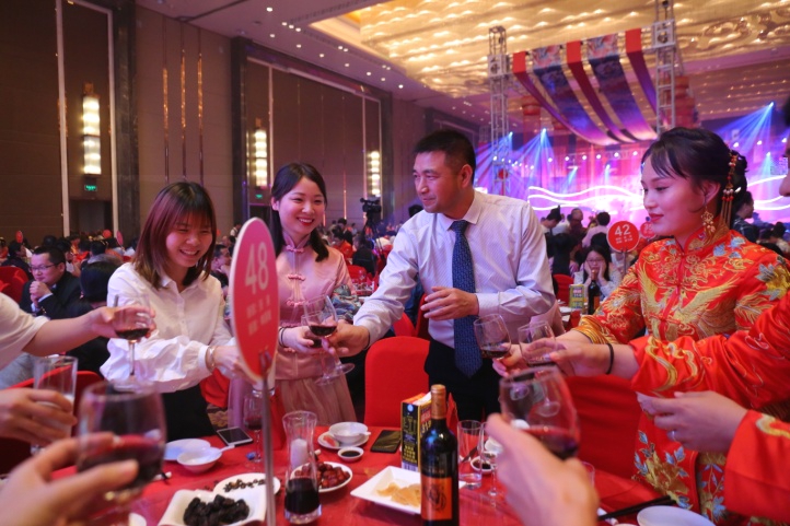 仪式圆满结束后,郭学斌为50对新人证婚并祝福这50对新人们婚姻幸福,地久天长。同时也希望他们担负起对家庭和社会的责任,共创辉煌灿烂的生活和事业。随后喜宴开始,宁德市总工会准备了精彩的歌舞表演为大家助兴,为新人送去美好祝福。大家欢声笑语,举杯畅饮,青拓集团行政总经理钟盛江还与青拓的10对新人碰杯并送上深深的祝福,新人们纷纷感谢宁德工会、青拓工会这些贴心的“娘家人”,并表示将坚定不移地在宁德这片沃土发挥自己的光和热。