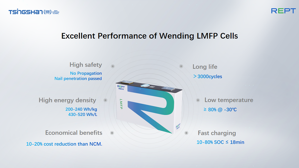 相比LFP与NCM电池,瑞浦兰钧推出的LMFP电池综合了LFP电池和NCM电池的优势性能,叠加瑞浦兰钧独创的Wending®技术后,进一步提升能量密度、循环寿命、低温性能、快充性能、安全性能等。