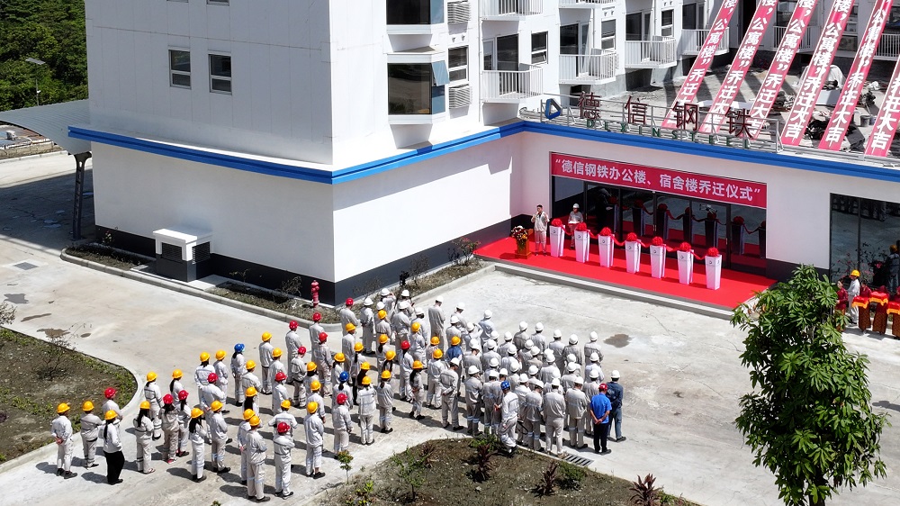 日前,位于印尼莫罗瓦利园区的德信钢铁有限公司举办乔迁仪式,首次将不锈钢装配式芯板建筑活楼引入东南亚。其办公楼和员工公寓楼工程项目活楼单个安装时间仅9—10天,德信办公楼地上6层,建筑面积5079㎡ ,地下车库面积1816㎡,楼内设有132个开放办公工位,并拥有中、高管办公室,会议室、阅览室、档案室、展厅、管控中心等不同空间;公寓楼7层,建筑面积4375㎡,拥有单、双人宿舍84间。办公楼和公寓楼活楼100%采用青拓集团有限公司自主研发的先进高强不锈钢QD2001和QN1804,这是青拓集团与远大可建合作共赢的又一海外应用案例。